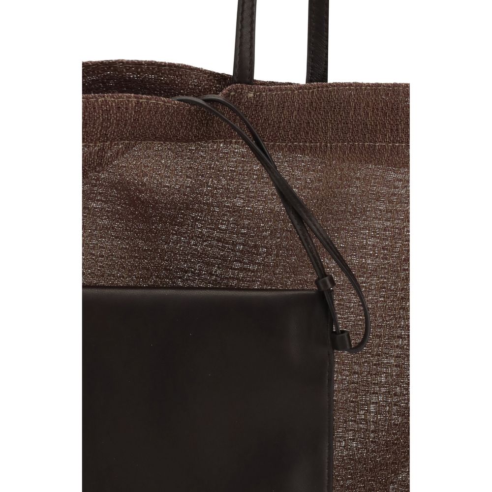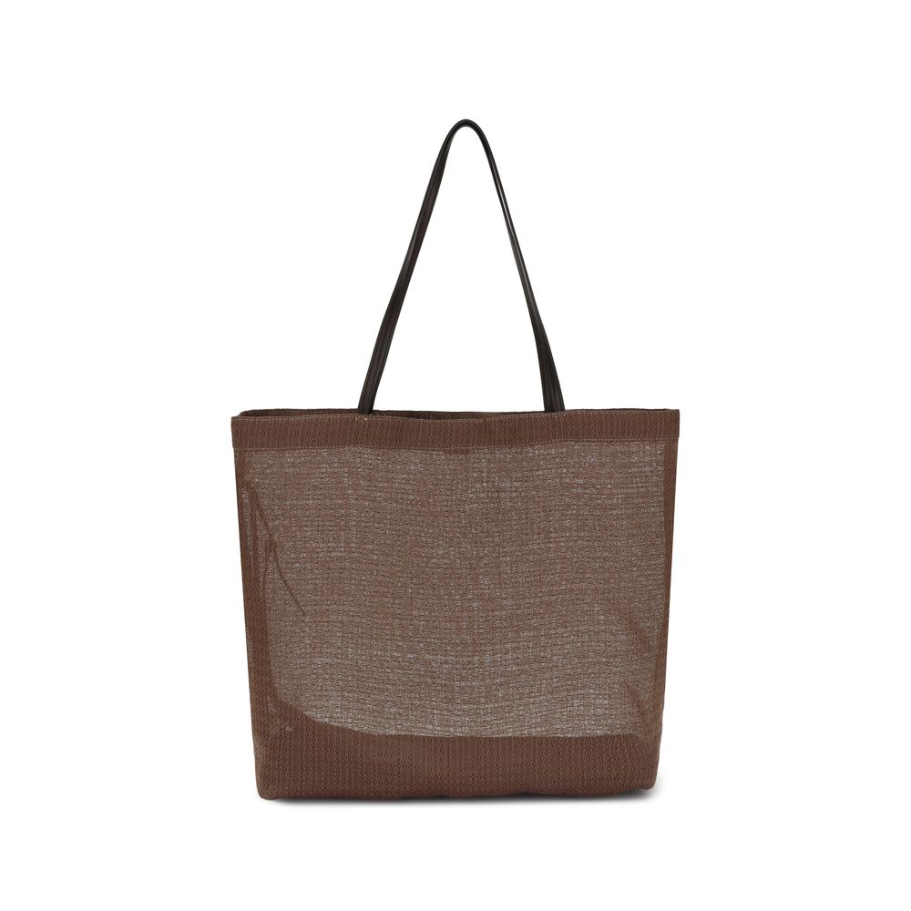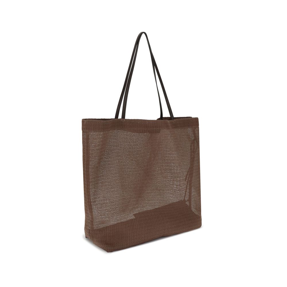 The Barn mesh Tote Bag by The Row is distinguished by its geometric design and woven workmanship, giving it lightness and contemporary style. Complemented by leather handles and a single interior pocket, it combines essentiality and sophistication in an accessory perfect for summer.