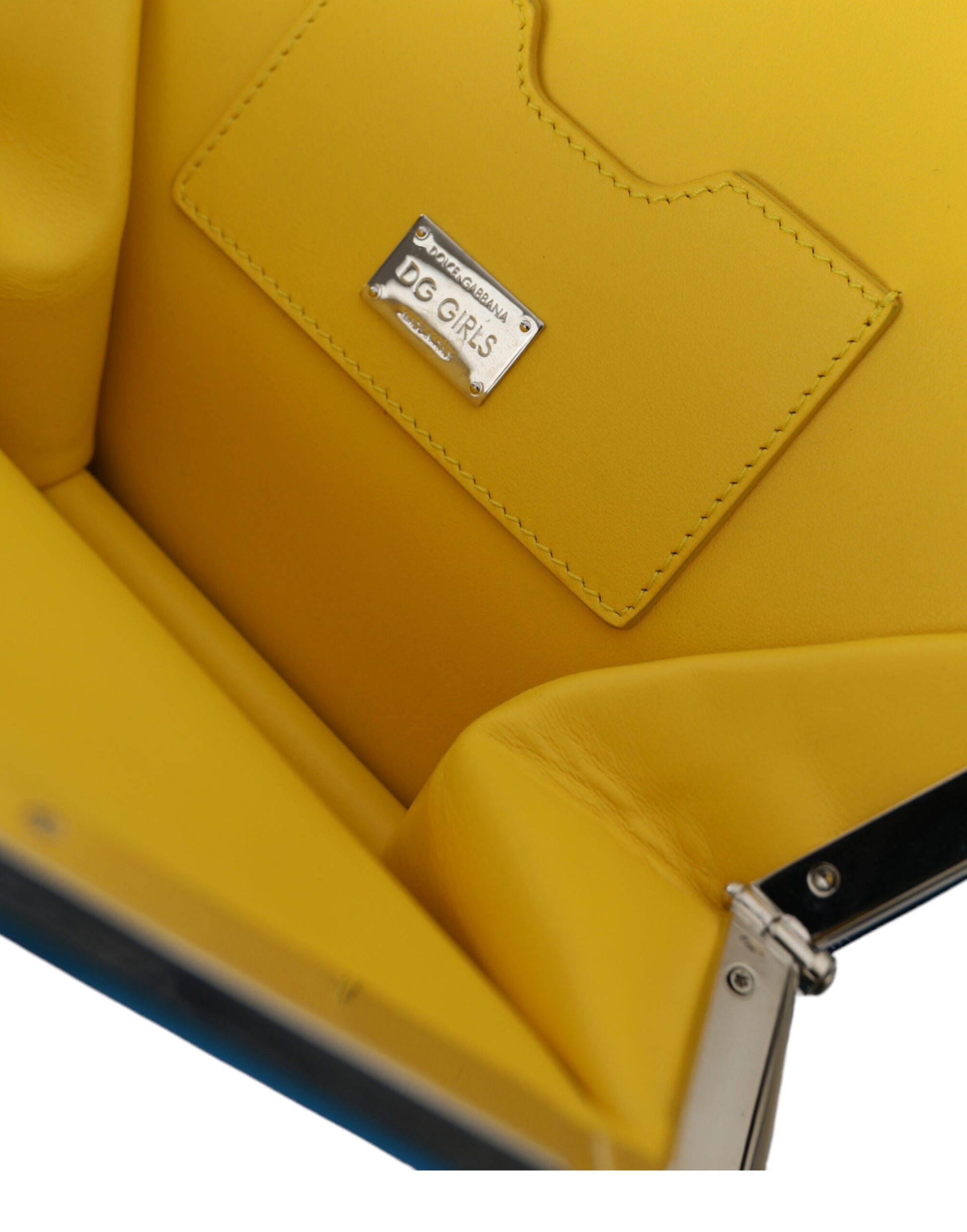 Absolutely stunning, 100% Authentic brand new Dolce & Gabbana shoulder bag crafted in glossy patent leather. This unique design comes in a vibrant blue “Celeste Mare” shade with a geometric silhouette. It features a bold silver-tone #DG logo on the front and a chic chain shoulder strap. The flap closure opens to a striking yellow leather-lined interior with a slip pocket and DG Girls logo plaque.