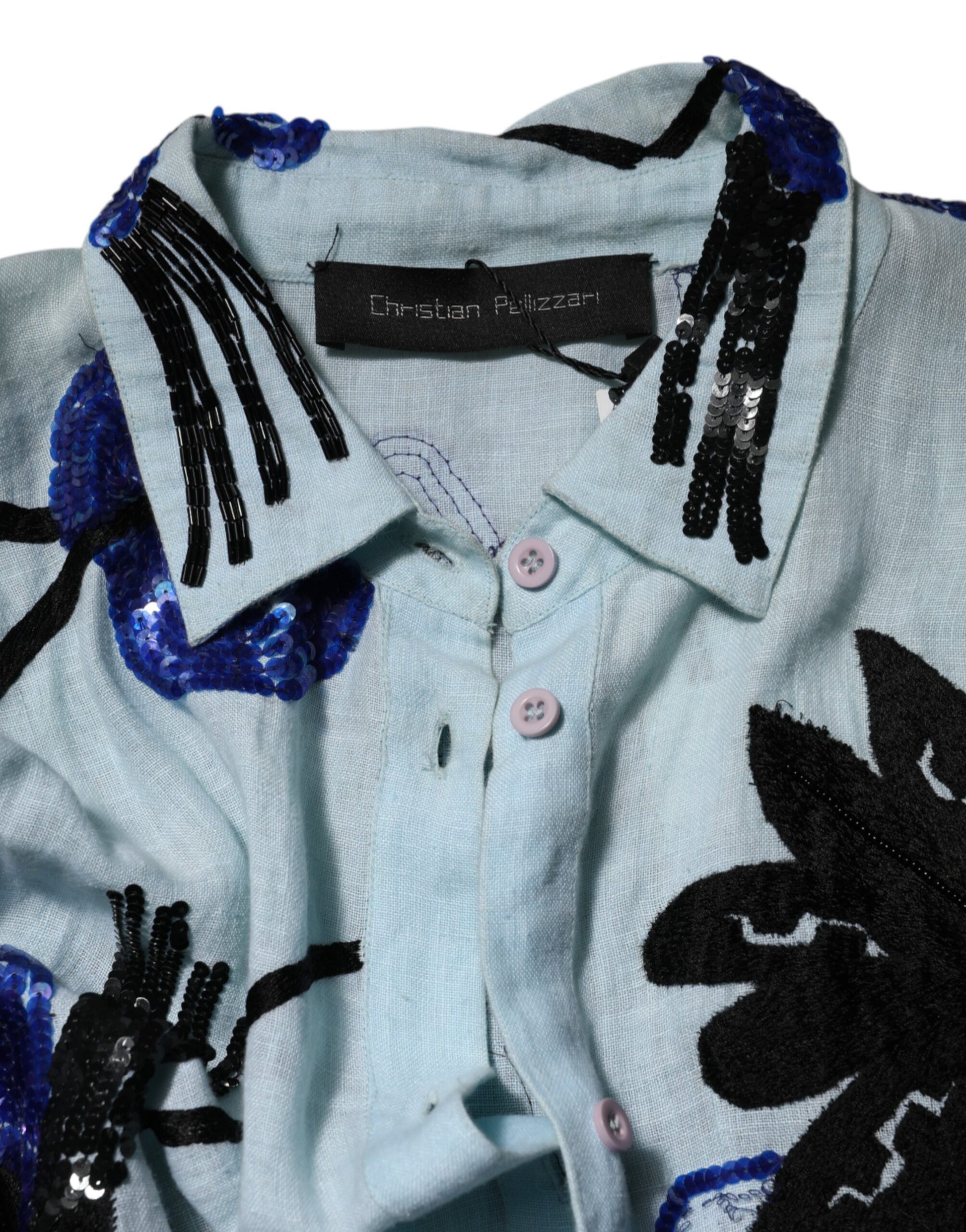 Gorgeous brand new, 100% Authentic CHRISTIAN PELLIZZARI women’s long shirt dress featuring a button-down front, pointed collar, drawstring waist with tassel details, and striking sequin embellishments in black and blue floral motifs. A bold and artistic maxi dress, perfect for making a statement.
